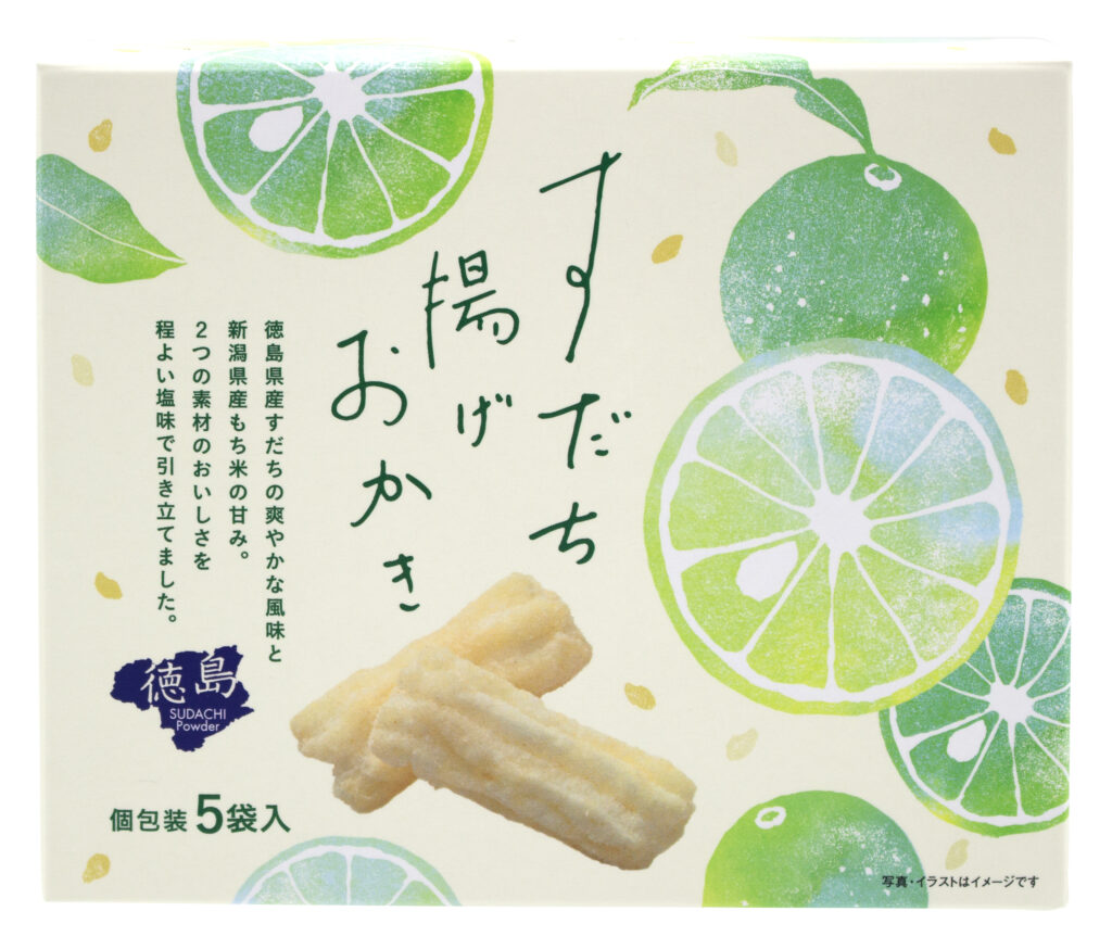 新潟県産もち米“わたぼうし”の一等米を指定入荷。カラッと揚げた生地に、徳島県産のすだち果汁パウダーを程よくまぶしました。